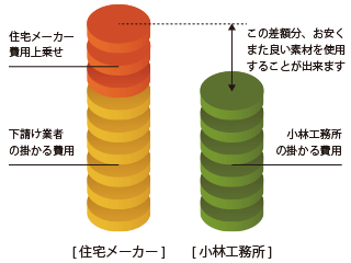 また、通常の工務店さんも造作工事など大工さんの仕事は自社で施工しますが、他の左官工事や基礎工事・仮設足場工事などは全て下請け業者さんにお願いしている為、どうしてもその分の不要な費用がかかってきてしまいます。